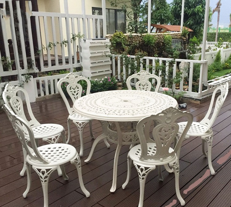 Chất liệu này không chỉ cứng cáp mà còn có khả năng kháng nước, kháng gỉ và hạn chế tối đa các tác động từ môi trường. Bạn có thể đặt bộ bàn ghế nhôm đúc nghệ thuật làm bàn ăn/bàn trà tại khu vực sân vườn/ban công mà không phải lo sợ thời tiết bào mòn.