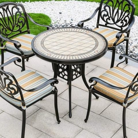 Bộ bàn ghế sân vườn nhôm đúc được làm bằng chất liệu nhôm đúc mặt lát gạch cao cấp khung bàn và ghế được phủ thêm hai lớp sơn tĩnh điện cao cấp. Chất liệu này không chỉ cứng cáp mà còn có khả năng kháng nước, kháng gỉ và hạn chế tối đa các tác động từ môi trường.Bạn có thể đặt bộ bàn ghế nhôm đúc nghệ thuật làm bàn ăn/bàn trà tại khu vực sân vườn/ban công mà không phải lo sợ thời tiết bào mòn.