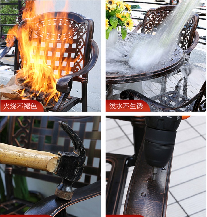 Tính năng của nhôm đúc: Chuyên dùng ngoài trời, chống thấm và chống nắng, chống ăn mòn, không rỉ sét. Bàn ghế đều là nhôm đúc nguyên khối rất chắc chắn, không ngại mưa nắng, phù hợp với nhiều môi trường ngoài trời, bền đẹp! [Phun bột tĩnh điện, bề mặt đã được sơn ở nhiệt độ cao 220 độ, công nghệ chạm khắc vi tính hoa văn tinh xảo,