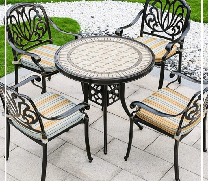 Bộ bàn ghế sân vườn nhôm đúc được làm bằng chất liệu nhôm đúc mặt lát gạch cao cấp khung bàn và ghế được phủ thêm hai lớp sơn tĩnh điện cao cấp. Chất liệu này không chỉ cứng cáp mà còn có khả năng kháng nước, kháng gỉ và hạn chế tối đa các tác động từ môi trường.Bạn có thể đặt bộ bàn ghế nhôm đúc nghệ thuật làm bàn ăn/bàn trà tại khu vực sân vườn/ban công mà không phải lo sợ thời tiết bào mòn.