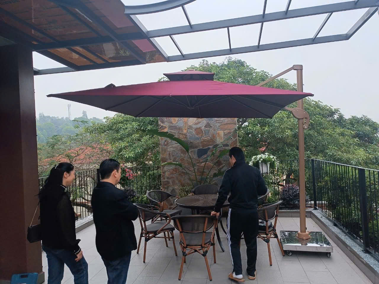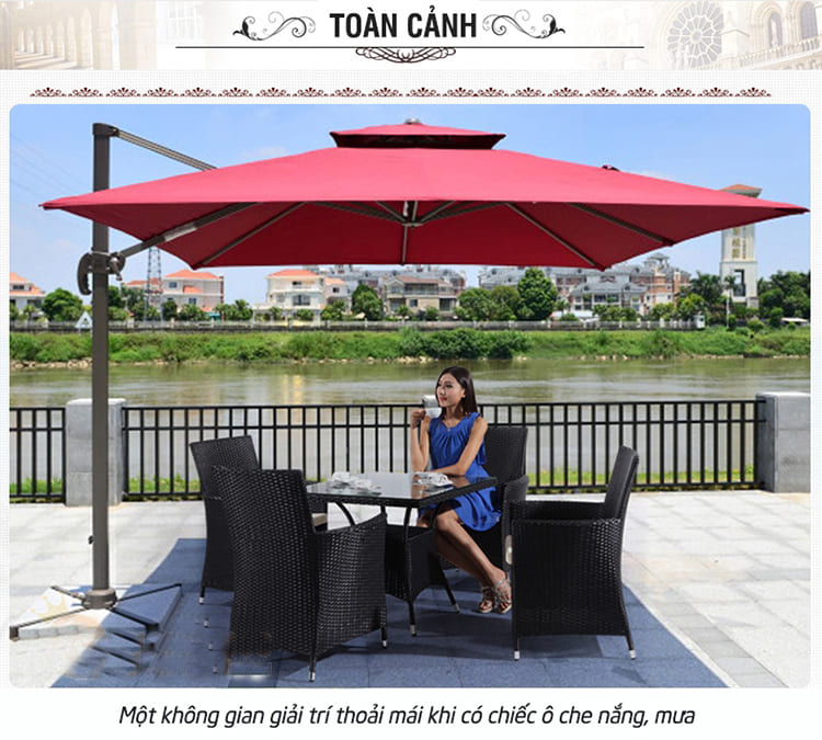 Dù hòa phát lệch tâm vuông 3m hợp kim nhôm xoay 360 màu đỏ dùng để trang trí sân vườn bạn có thể xoay và điều chỉnh mọi hướng, nấc xoay 360 độ giúp bạn dễ dàng điều chính theo hướng nắng một cách thoải mãi và mang đến khả năng che nắng hoàn hỏa nhất, bạn có thể điều chỉnh ô nghiêng theo ý muốn mà không cân mất thời gian để dịch chuyển cả chân đế của ô.