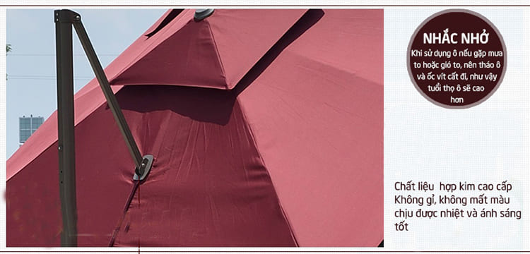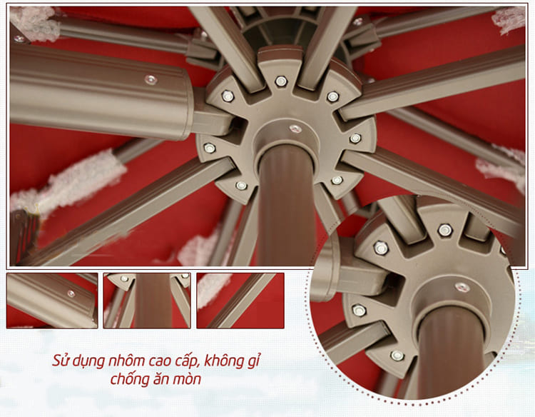 Khung và nan ô làm từ chất liệu hợp kim nhôm cao cấp được phủ thêm một lớp sơn tĩnh điện giúp cho sản phẩm được bền hơn, chịu được mọi thời tiết mưa nắng ngoài trời.