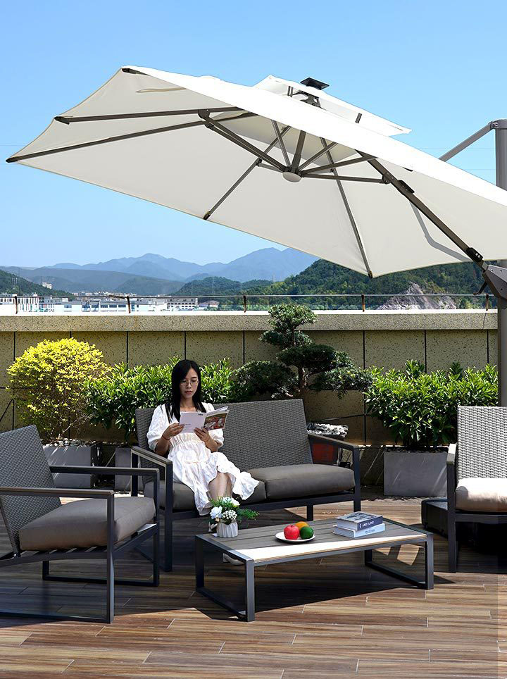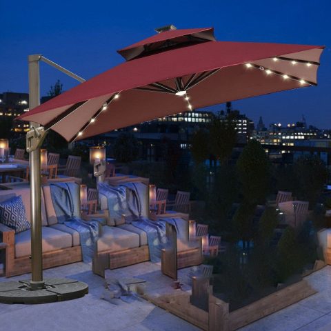 Ô lệch tâm có đèn 3x3m hợp kim có đèn dạng sao màu đỏ mận đế nhựa đổ nước dùng để trang trí sân vườn bạn có thể xoay và điều chỉnh mọi hướng, nấc xoay 360 độ giúp bạn dễ dàng điều chính theo hướng nắng một cách thoải mãi và mang đến khả năng che nắng hoàn hỏa nhất, bạn có thể điều chỉnh ô nghiêng theo ý muốn mà không cân mất thời gian để dịch chuyển cả chân đế của ô.